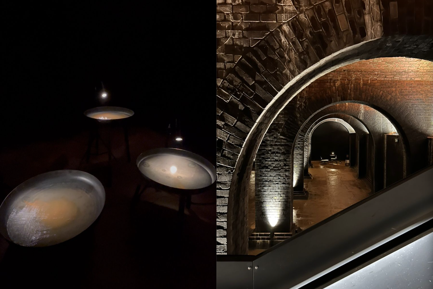 Sonorous Bodies of Water is both a sound installation and water ritual, where water, sound, light and bodies interact with one another. The installation draws upon the history of healing waters and water-medicine in the Czech Republic. The installation’s “healing waters” are contained within three large metal singing bowls located in Brno’s historic water tank. These singing bowls are activated by sonic impulses, which excites the surface of the water to a state of dynamic geometric movement (Faraday waves). The sonic resonance of the bowls and water fills the water tank with sound and vibrates our own watery bodies, while the movements of the water are reflected with light. The sound frequencies of the different bowls change over time, sometimes coming together harmoniously and at other times sounding discordant.
